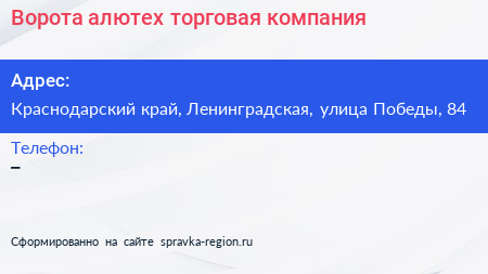 Ворота-алютех, торговая компания по адресу Краснодарский край, Ленинградская, улица Победы, 84 в дальнейшем Организация, размещена в следующих категориях: