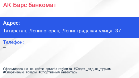 АК Барс, банкомат по адресу Татарстан, Лениногорск, Ленинградская улица, 37 в дальнейшем Организация, размещена в следующих категориях: