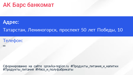 АК Барс, банкомат по адресу Татарстан, Лениногорск, проспект 50 лет Победы, 10 в дальнейшем Организация, размещена в следующих категориях: