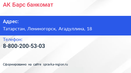 АК Барс, банкомат по адресу Татарстан, Лениногорск, Агадуллина, 18 в дальнейшем Организация, размещена в следующих категориях: