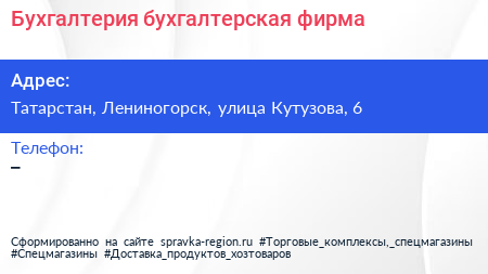 Бухгалтерия, бухгалтерская фирма по адресу Татарстан, Лениногорск, улица Кутузова, 6 в дальнейшем Организация, размещена в следующих категориях: