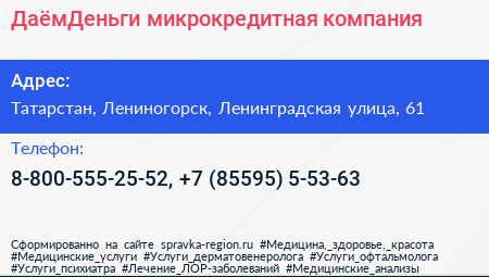 ДаёмДеньги, микрокредитная компания по адресу Татарстан, Лениногорск, Ленинградская улица, 61 в дальнейшем Организация, размещена в следующих категориях: