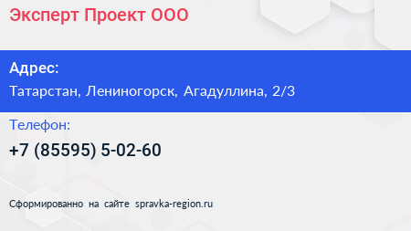 Эксперт-Проект, ООО по адресу Татарстан, Лениногорск, Агадуллина, 2/3 в дальнейшем Организация, размещена в следующих категориях: