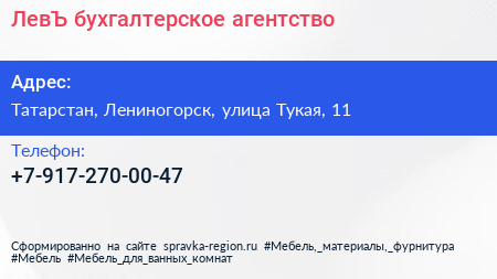 ЛевЪ, бухгалтерское агентство по адресу Татарстан, Лениногорск, улица Тукая, 11 в дальнейшем Организация, размещена в следующих категориях:
