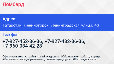 Ломбард по адресу Татарстан, Лениногорск, Ленинградская улица, 43 в дальнейшем Организация, размещена в следующих категориях: