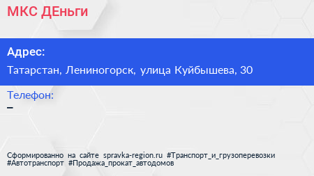 МКС ДЕньги по адресу Татарстан, Лениногорск, улица Куйбышева, 30 в дальнейшем Организация, размещена в следующих категориях: