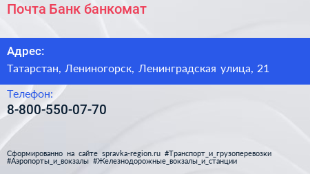 Почта Банк, банкомат по адресу Татарстан, Лениногорск, Ленинградская улица, 21 в дальнейшем Организация, размещена в следующих категориях: