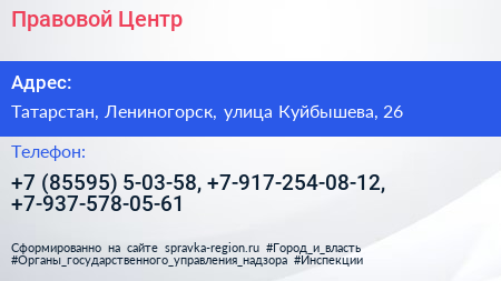 Правовой Центр по адресу Татарстан, Лениногорск, улица Куйбышева, 26 в дальнейшем Организация, размещена в следующих категориях: