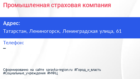 Промышленная страховая компания по адресу Татарстан, Лениногорск, Ленинградская улица, 61 в дальнейшем Организация, размещена в следующих категориях: