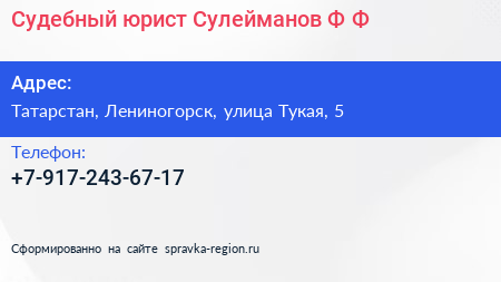 Судебный юрист Сулейманов Ф.Ф. по адресу Татарстан, Лениногорск, улица Тукая, 5 в дальнейшем Организация, размещена в следующих категориях: