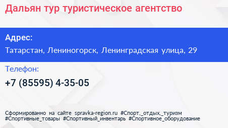 Дальян тур, туристическое агентство по адресу Татарстан, Лениногорск, Ленинградская улица, 29 в дальнейшем Организация, размещена в следующих категориях: