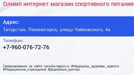 Олимп, интернет-магазин спортивного питания по адресу Татарстан, Лениногорск, улица Чайковского, 4а в дальнейшем Организация, размещена в следующих категориях: