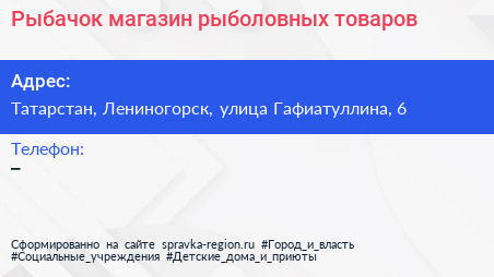 Рыбачок, магазин рыболовных товаров по адресу Татарстан, Лениногорск, улица Гафиатуллина, 6 в дальнейшем Организация, размещена в следующих категориях:
