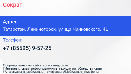 Сократ по адресу Татарстан, Лениногорск, улица Чайковского, 41 в дальнейшем Организация, размещена в следующих категориях: