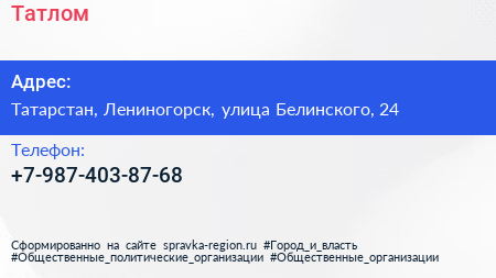 Татлом по адресу Татарстан, Лениногорск, улица Белинского, 24 в дальнейшем Организация, размещена в следующих категориях: