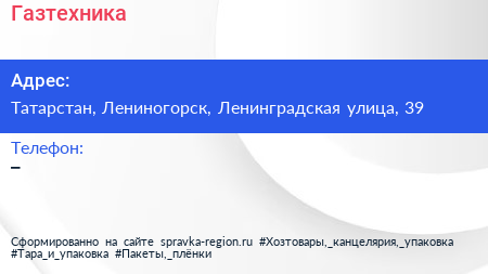 Газтехника по адресу Татарстан, Лениногорск, Ленинградская улица, 39 в дальнейшем Организация, размещена в следующих категориях: