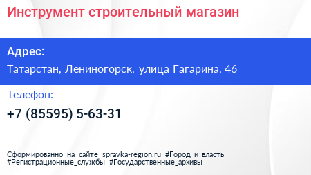 Инструмент, строительный магазин по адресу Татарстан, Лениногорск, улица Гагарина, 46 в дальнейшем Организация, размещена в следующих категориях: