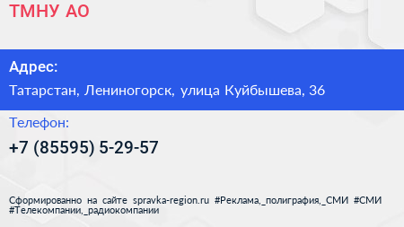 ТМНУ, АО по адресу Татарстан, Лениногорск, улица Куйбышева, 36 в дальнейшем Организация, размещена в следующих категориях: