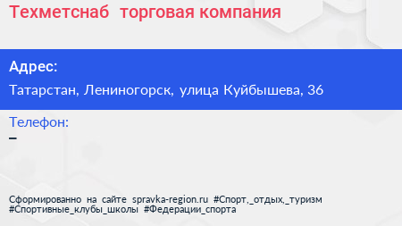 Техметснаб+, торговая компания по адресу Татарстан, Лениногорск, улица Куйбышева, 36 в дальнейшем Организация, размещена в следующих категориях: