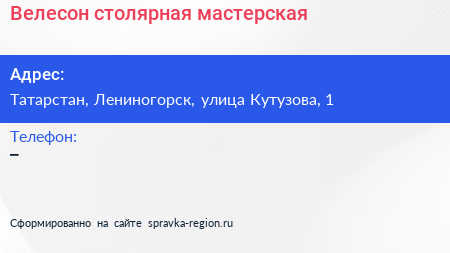 Велесон, столярная мастерская по адресу Татарстан, Лениногорск, улица Кутузова, 1 в дальнейшем Организация, размещена в следующих категориях: