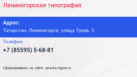 Лениногорская типография по адресу Татарстан, Лениногорск, улица Тукая, 5 в дальнейшем Организация, размещена в следующих категориях: