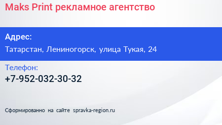 Maks Print, рекламное агентство по адресу Татарстан, Лениногорск, улица Тукая, 24 в дальнейшем Организация, размещена в следующих категориях: