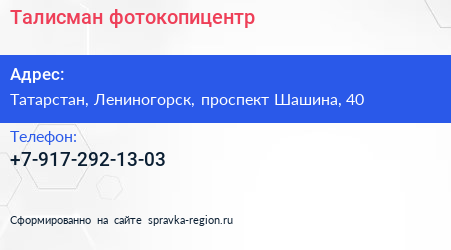 Талисман, фотокопицентр по адресу Татарстан, Лениногорск, проспект Шашина, 40 в дальнейшем Организация, размещена в следующих категориях: