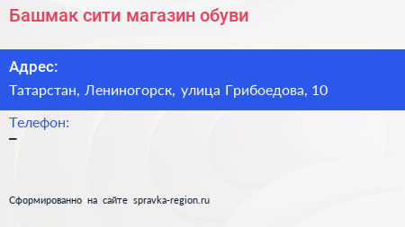 Башмак сити, магазин обуви по адресу Татарстан, Лениногорск, улица Грибоедова, 10 в дальнейшем Организация, размещена в следующих категориях: