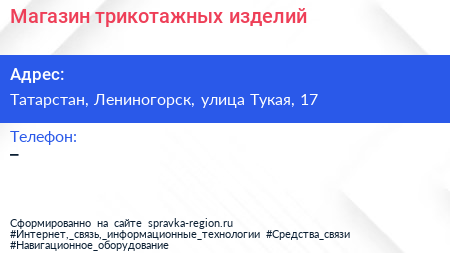 Магазин трикотажных изделий по адресу Татарстан, Лениногорск, улица Тукая, 17 в дальнейшем Организация, размещена в следующих категориях: