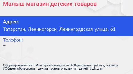 Малыш, магазин детских товаров по адресу Татарстан, Лениногорск, Ленинградская улица, 61 в дальнейшем Организация, размещена в следующих категориях: