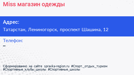 Miss, магазин одежды по адресу Татарстан, Лениногорск, проспект Шашина, 12 в дальнейшем Организация, размещена в следующих категориях:
