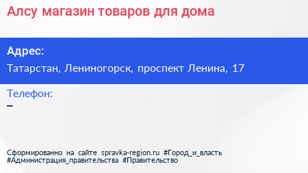Алсу, магазин товаров для дома по адресу Татарстан, Лениногорск, проспект Ленина, 17 в дальнейшем Организация, размещена в следующих категориях: