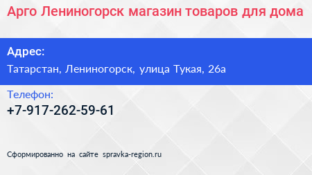 Арго Лениногорск, магазин товаров для дома по адресу Татарстан, Лениногорск, улица Тукая, 26а в дальнейшем Организация, размещена в следующих категориях: