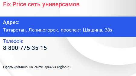 Fix Price, сеть универсамов по адресу Татарстан, Лениногорск, проспект Шашина, 38а в дальнейшем Организация, размещена в следующих категориях: