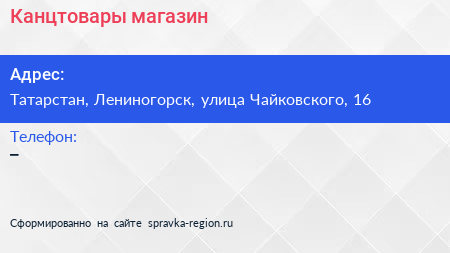 Канцтовары, магазин по адресу Татарстан, Лениногорск, улица Чайковского, 16 в дальнейшем Организация, размещена в следующих категориях: