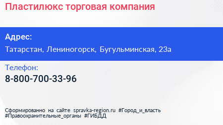 Пластилюкс, торговая компания по адресу Татарстан, Лениногорск, Бугульминская, 23а в дальнейшем Организация, размещена в следующих категориях: