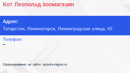 Кот Леопольд, зоомагазин по адресу Татарстан, Лениногорск, Ленинградская улица, 45 в дальнейшем Организация, размещена в следующих категориях: