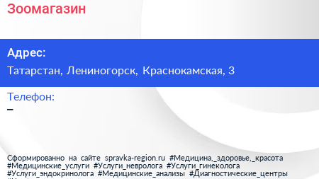 Зоомагазин по адресу Татарстан, Лениногорск, Краснокамская, 3 в дальнейшем Организация, размещена в следующих категориях: