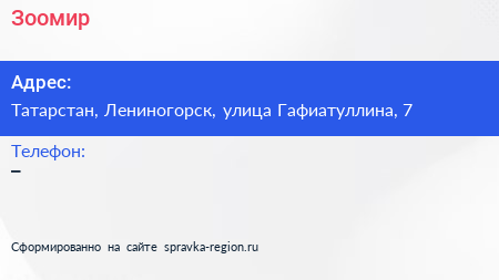 Зоомир по адресу Татарстан, Лениногорск, улица Гафиатуллина, 7 в дальнейшем Организация, размещена в следующих категориях: