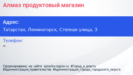 Алмаз, продуктовый магазин по адресу Татарстан, Лениногорск, Степная улица, 3 в дальнейшем Организация, размещена в следующих категориях: