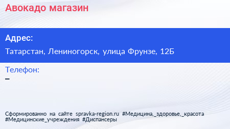 Авокадо, магазин по адресу Татарстан, Лениногорск, улица Фрунзе, 12Б в дальнейшем Организация, размещена в следующих категориях: