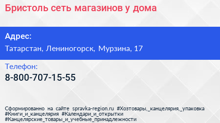 Бристоль, сеть магазинов у дома по адресу Татарстан, Лениногорск, Мурзина, 17 в дальнейшем Организация, размещена в следующих категориях: