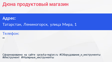 Дюна, продуктовый магазин по адресу Татарстан, Лениногорск, улица Мира, 1 в дальнейшем Организация, размещена в следующих категориях:
