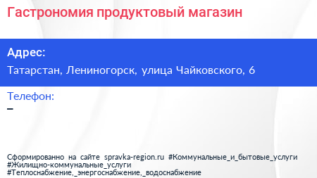 Гастрономия, продуктовый магазин по адресу Татарстан, Лениногорск, улица Чайковского, 6 в дальнейшем Организация, размещена в следующих категориях: