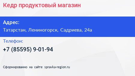 Кедр, продуктовый магазин по адресу Татарстан, Лениногорск, Садриева, 24а в дальнейшем Организация, размещена в следующих категориях: