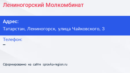 Лениногорский Молкомбинат по адресу Татарстан, Лениногорск, улица Чайковского, 3 в дальнейшем Организация, размещена в следующих категориях:
