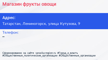 Магазин фрукты-овощи по адресу Татарстан, Лениногорск, улица Кутузова, 9 в дальнейшем Организация, размещена в следующих категориях: