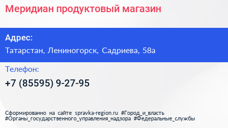 Меридиан, продуктовый магазин по адресу Татарстан, Лениногорск, Садриева, 58а в дальнейшем Организация, размещена в следующих категориях: