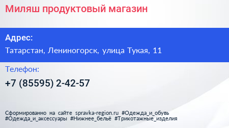 Миляш, продуктовый магазин по адресу Татарстан, Лениногорск, улица Тукая, 11 в дальнейшем Организация, размещена в следующих категориях: