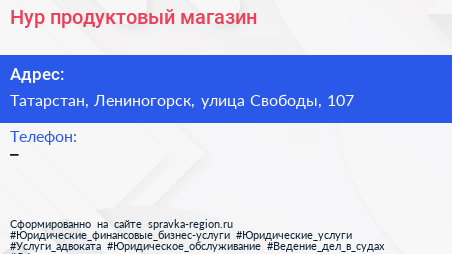 Нур, продуктовый магазин по адресу Татарстан, Лениногорск, улица Свободы, 107 в дальнейшем Организация, размещена в следующих категориях: